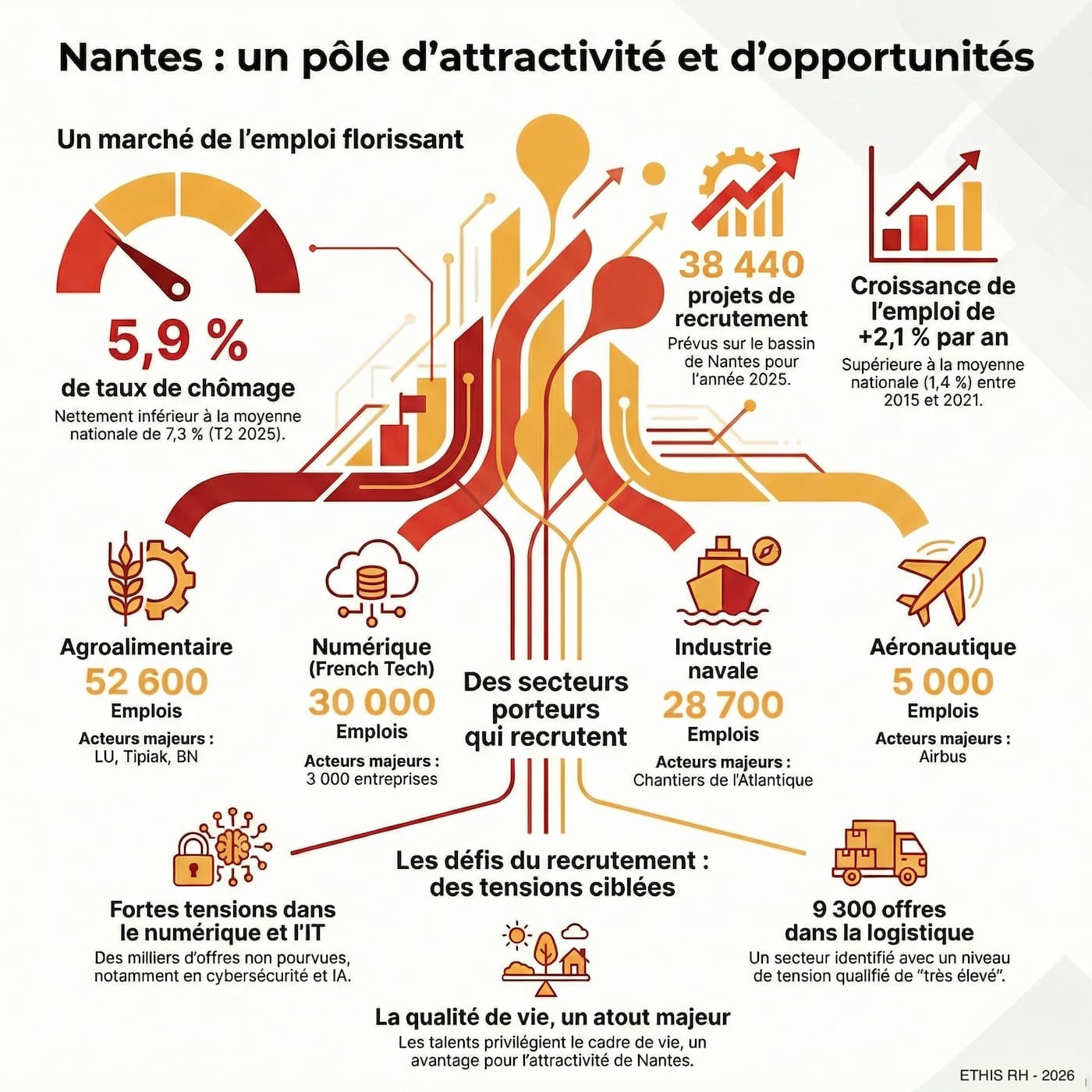 Cette dynamique fait de Nantes un territoire particulièrement propice au développement des activités de recrutement et d'accompagnement RH, où les cabinets spécialisés comme Ethis RH jouent un rôle essentiel d'intermédiaire entre entreprises en recherche de compétences et talents cherchant à s'épanouir professionnellement.
