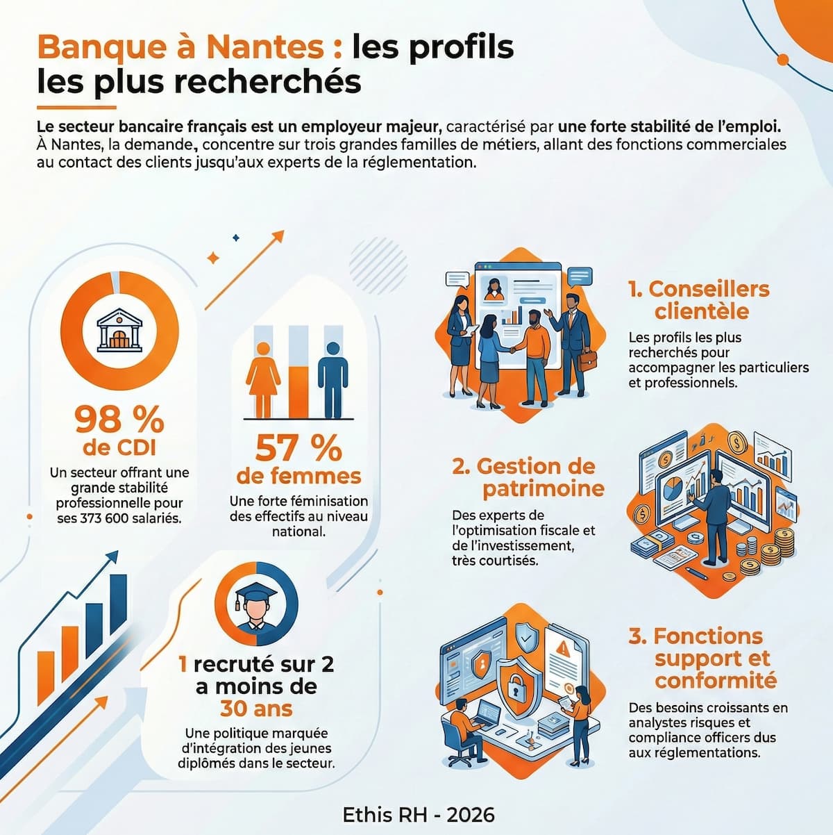 Le secteur bancaire français employait 373 600 salariés fin 2024 selon la Fédération Bancaire Française, avec un taux de CDI de 98% et une forte féminisation des effectifs (57%). À Nantes, plusieurs familles de métiers concentrent l'essentiel des besoins.