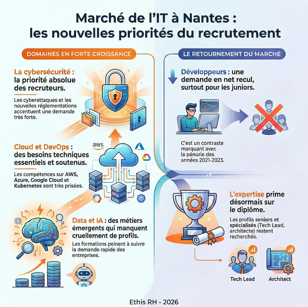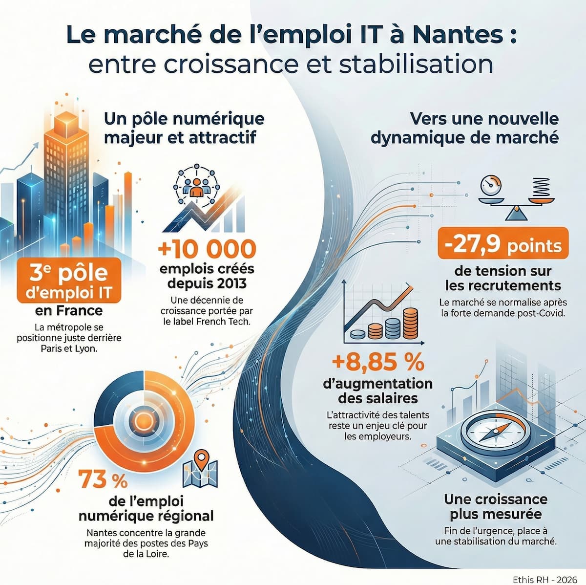 Les perspectives restent favorables malgré la stabilisation du marché. Nantes demeure le 3e pôle numérique français avec 28 800 emplois. La transformation digitale des entreprises, les enjeux de cybersécurité et l'essor de l'intelligence artificielle garantissent une demande soutenue sur les profils qualifiés. Les experts et spécialistes bénéficieront des meilleures opportunités.